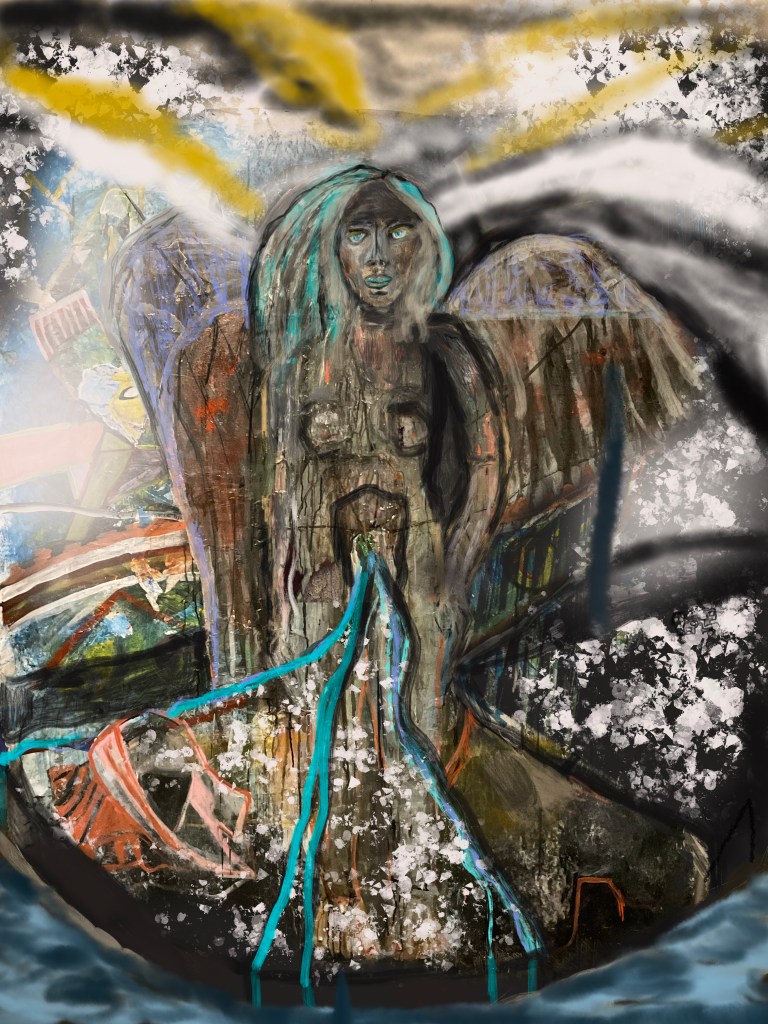 Hier habe ich mein Mami Wata-Bild digitalisiert und mit Procreate weiterverarbeitet. Es ist, wie ich meine, ein ganz neues Bild entstanden, was ich “Todesengel” nenne. Letztendlich tritt in diesem Bild, mehr als im bildnerischen Original, ein Aspekt der Göttin, der ihr inhärent ja gegeben ist, mit aller Deutlichkeit visuell zu Tage: ihr dunkler Aspekt!