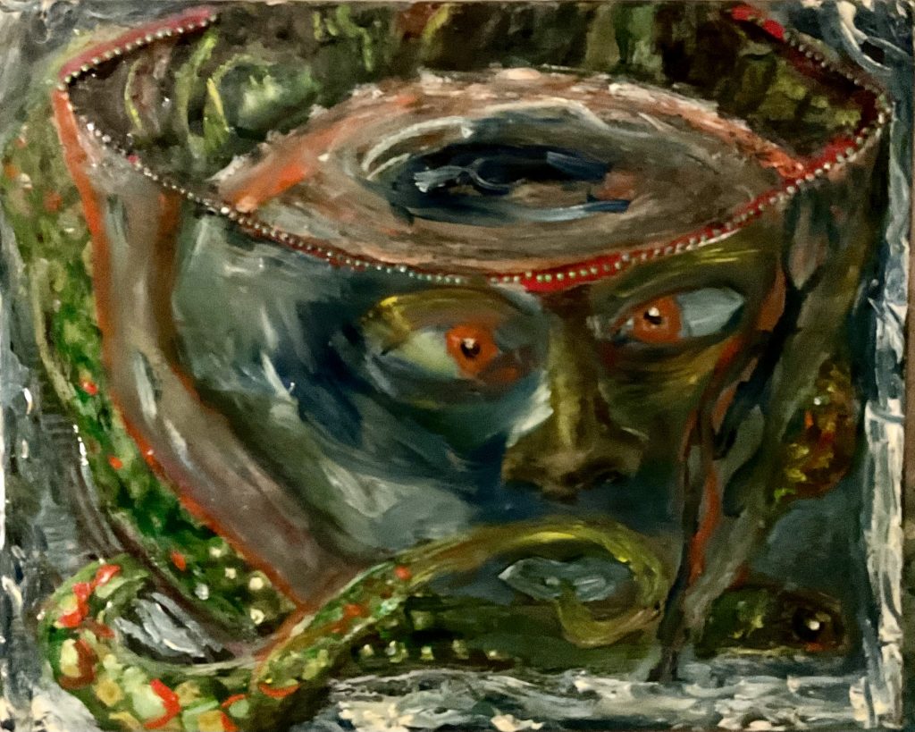 Der Gral zeigt eine Offenheit nach oben und eine Geschlossenheit nach unten. Bei meinem Bild ist er von einer Schlange umgeben, die in diesem Fall Symbol für die männliche Energie sein soll, die der weiblichen des Gefäßes gegenübersteht. Die Schlange verweist auch auf die Heilige Lanze (Longinuslanze). In meinem Bild führt der Schwanz der Schlange in den Mund des Gesichtes, das auf den Gral zu sehen ist.