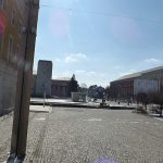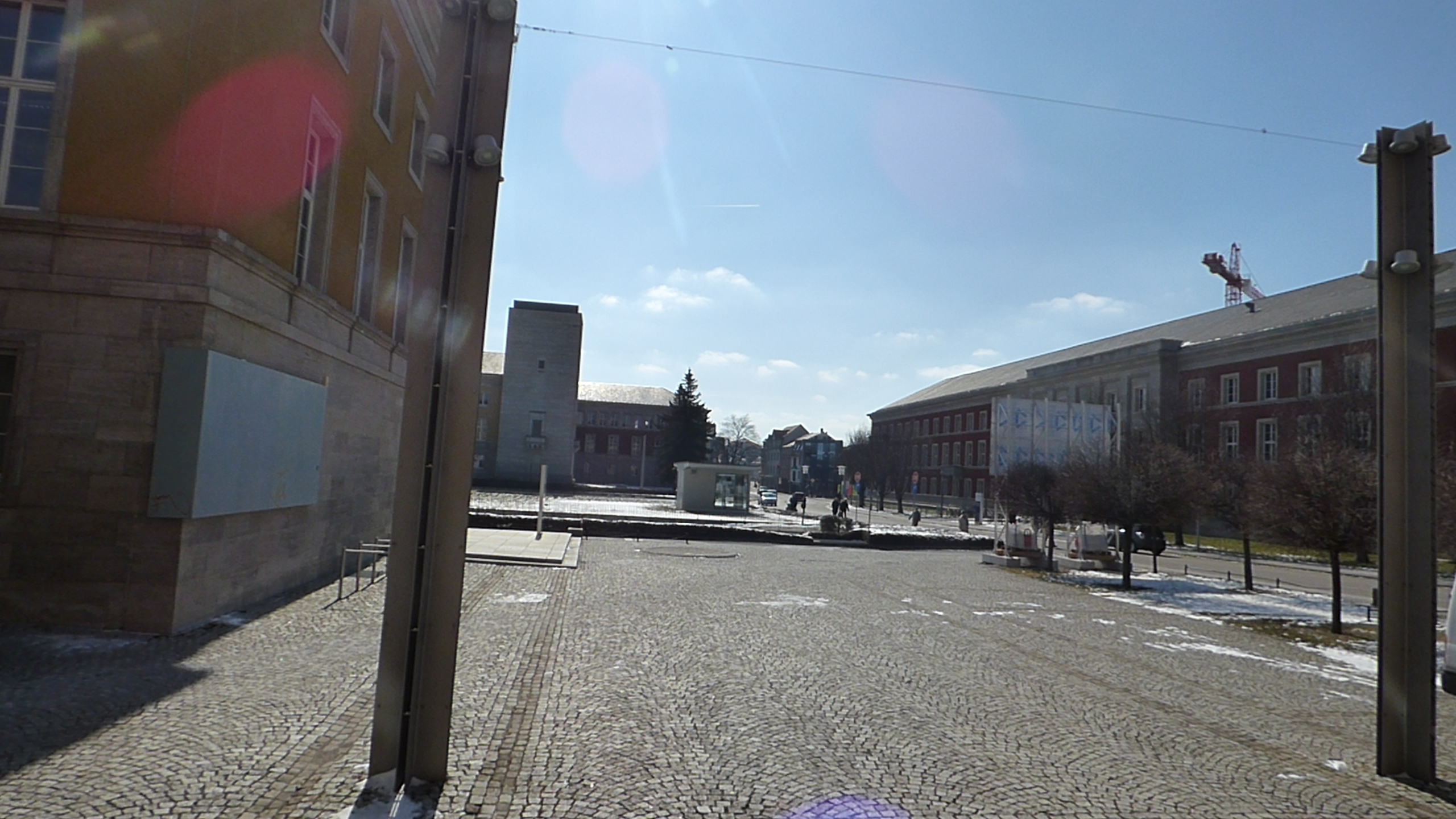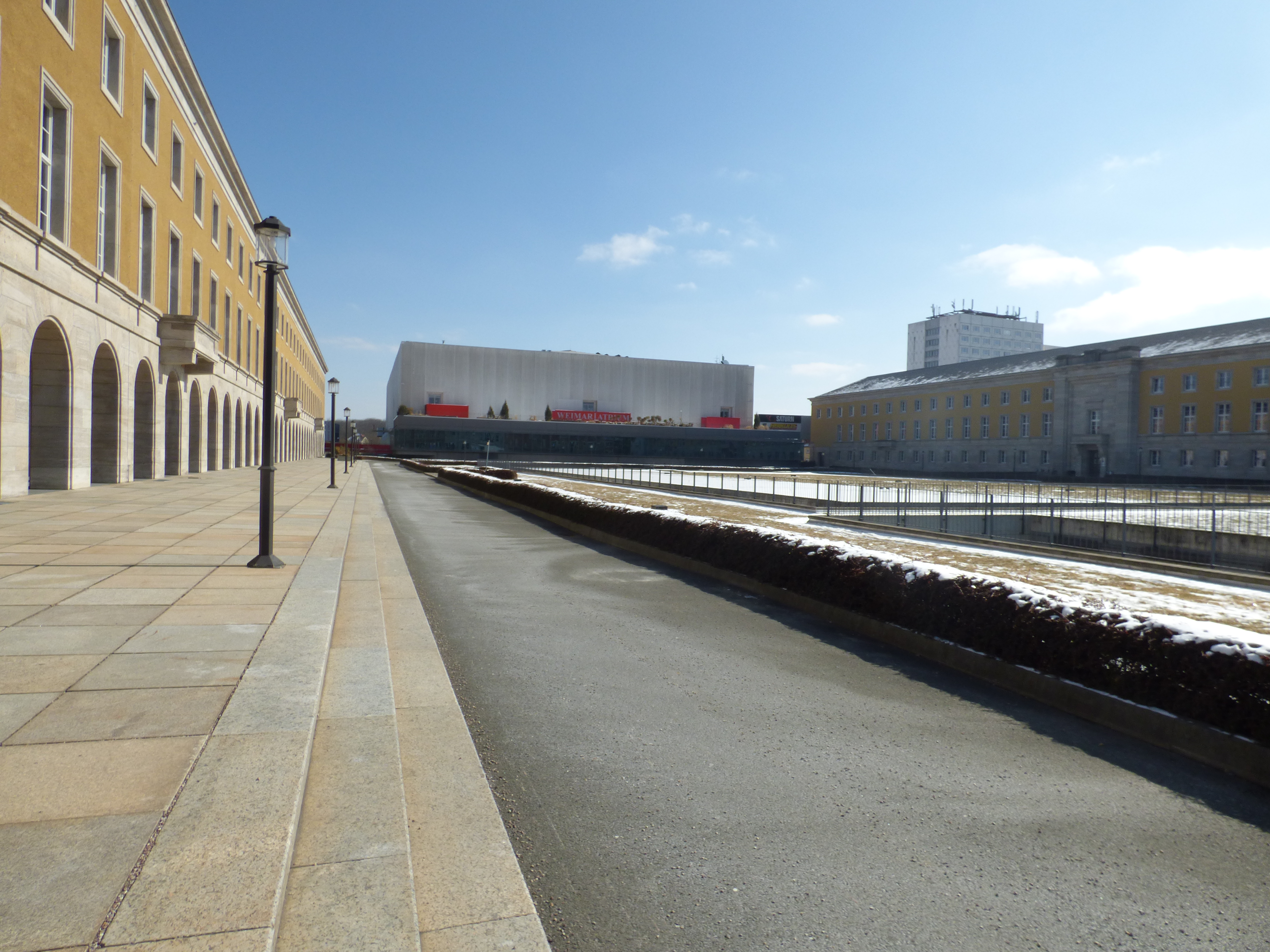Blick auf das Gauforum, wobei ich vor dem jetzigen Einkaufszentrum stehe. Der Bagger zeigt den Bauplatz des Bauhaus-Museums an.