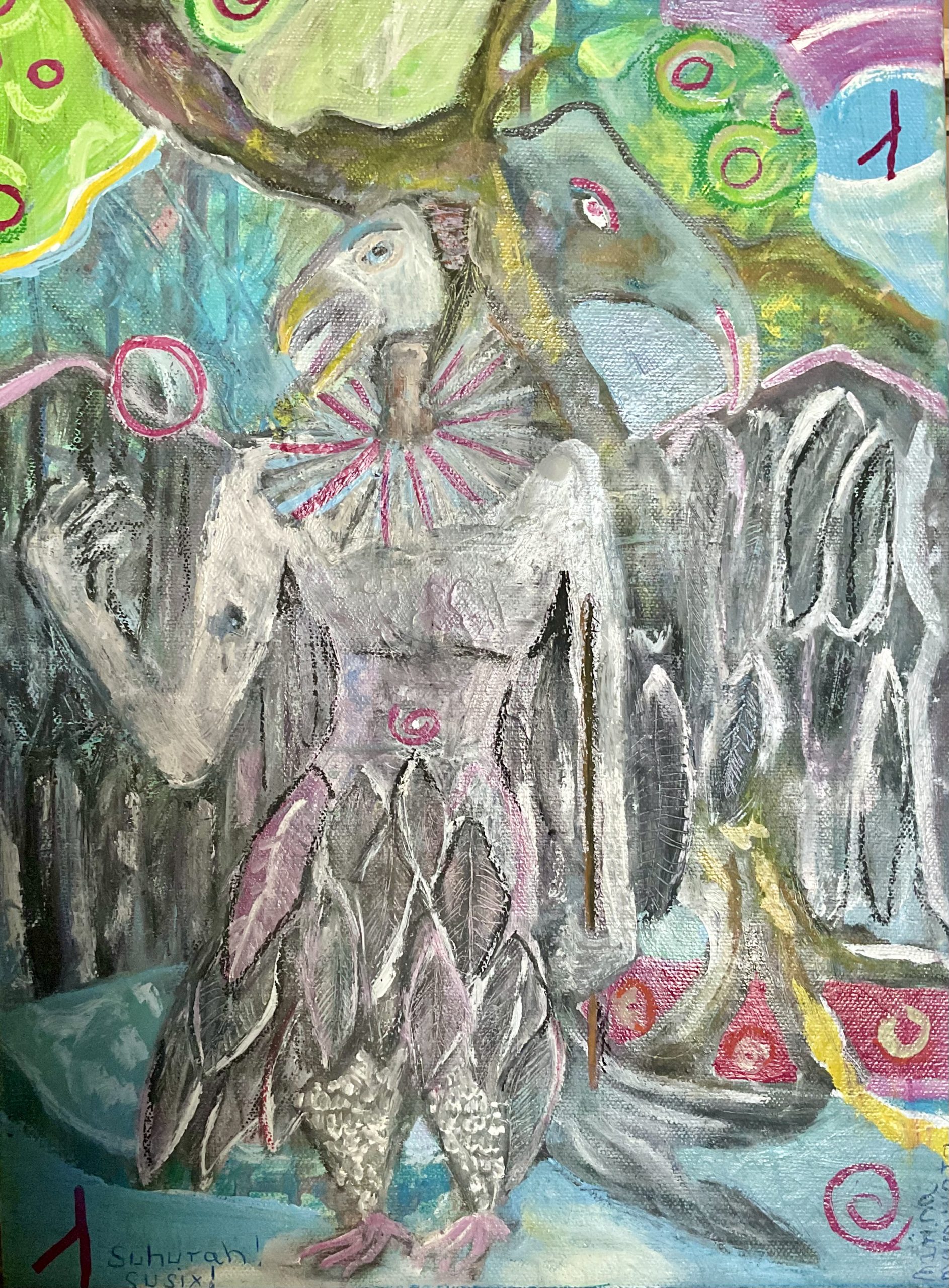 Interessanterweise begleitet mich die Geierin schon seit Jahren. In meinem Buch “Mami Wata Tanz” schrieb ich über eine Feder, die ich am Strand gefunden habe und die von diesem mächtigen Vogel stammt. Anscheinend war mir die Bedeutung, die diese Vogelart für mich hat, in der Zwischenzeit aus dem Bewusstsein entschwunden, wohl überlagert von all den Erfordernissen des Alltags, die uns einerseits mit Wachstumspotential versorgen, auf der anderen Seite uns aber auch ablenken, von dem, was unsere eigentliche Aufgabe im Leben ist. Im Hintergrund war meine Beziehung zu dem Geier aber nie abgebrochen und hat sich durch eine künstlerische Arbeit, die bei mir ja niemals geplant ist, wieder in den aktuellen Fokus gebracht.