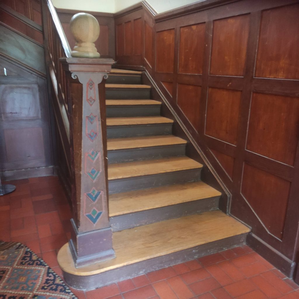 Im Innern begeistert uns vor allem der repräsentative Eingangsbereich mit einer kunstvoll verzierten Treppe.