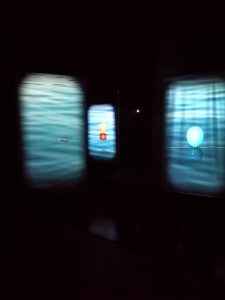 Auf einer großen Leinwand wird orakelt, bevor man eine dunkle Halle, eine Art fünfschiffigen Sakralbau im Sannierungszustand betritt, deren Empore einen Ausblick auf das Environment, das nun durch Spiegel und eine weite Wasserfläche verzerrt ist, bietet. Eine Initiationserfahrung?