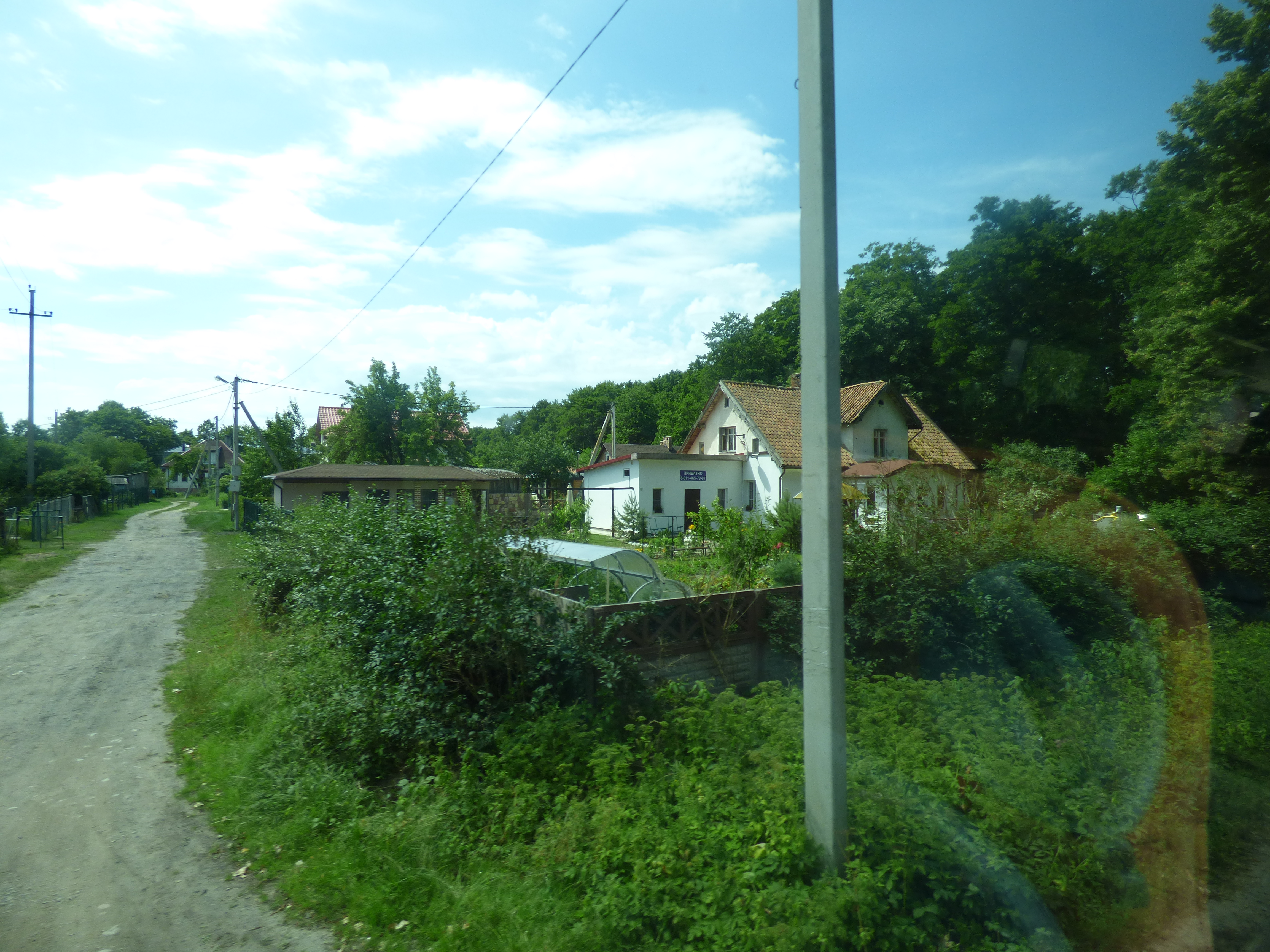 (Montag, 9. Juli) Von Königsberg fahren wir zum russischen Teil der Nehrung und passieren dabei Kranz/Selenogradsk. Für den Eintritt in den Nationalpark, der als ein solcher schon in der deutschen Zeit bestand, muss Eintritt bezahlt werden. Die Straße führt dann schnurgerade und monoton durch Wälder, mit Bäumen, die sich zur Seite lehnen. In den Dörfern stehen noch viele Häuser aus deutscher Zeit,die allerdings nich immer im guten Zustand sind. Alles wirkt wie aus der Zeit gefallen. Da wir keine Zwischenstopps einlegen, bekomme ich kein Gefühl für die besondere Qualität der Nehrung, die ja als Landzunge zwischen Kurisches Haff und Ostsee liegt. Wasser werde ich erst sehen, als wir unser erstes Zwischenziel, die Vogelwarte Rositten, erreicht haben.