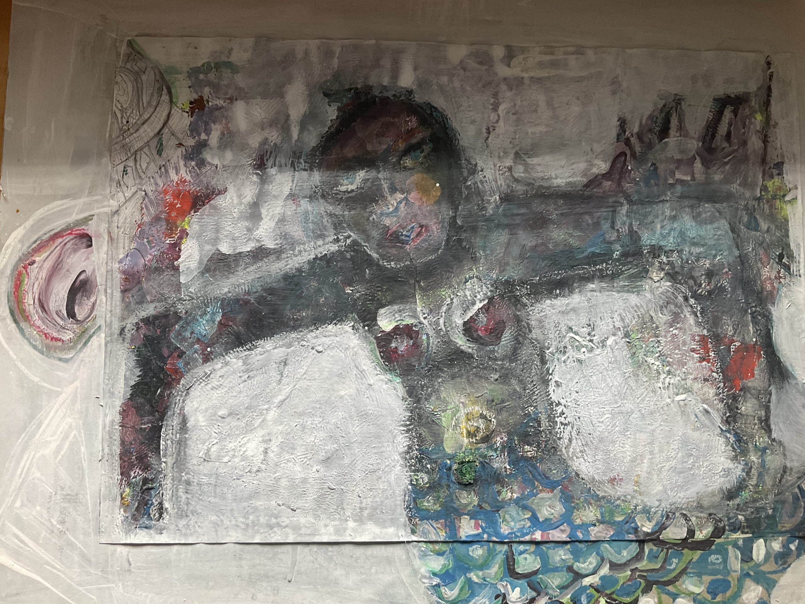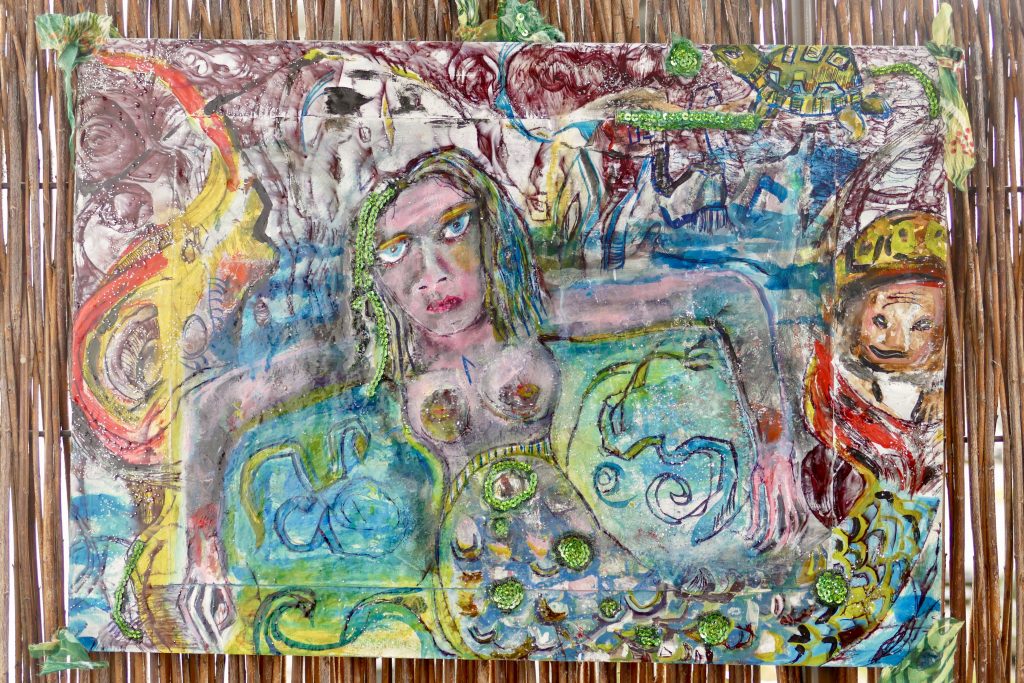 Das nächste Foto zeigt die zweite Phase im Werden meines Mami Wata-Bildes. Hier ist schon viel passiert. Die Kugelschreiber-Kritzeleien haben Spiralen und Unterwasserlandschaften gebildet. Aus Wasserbewegungen wurden Seeschlangen und die Hände der Göttin haben sich in Krallen verwandelt.