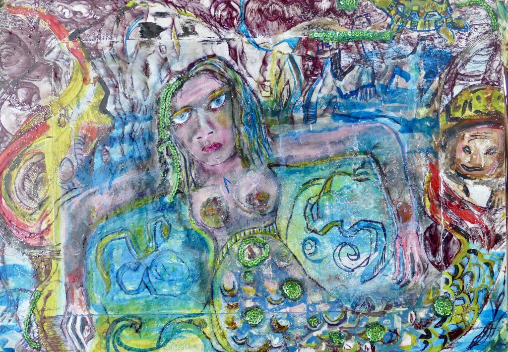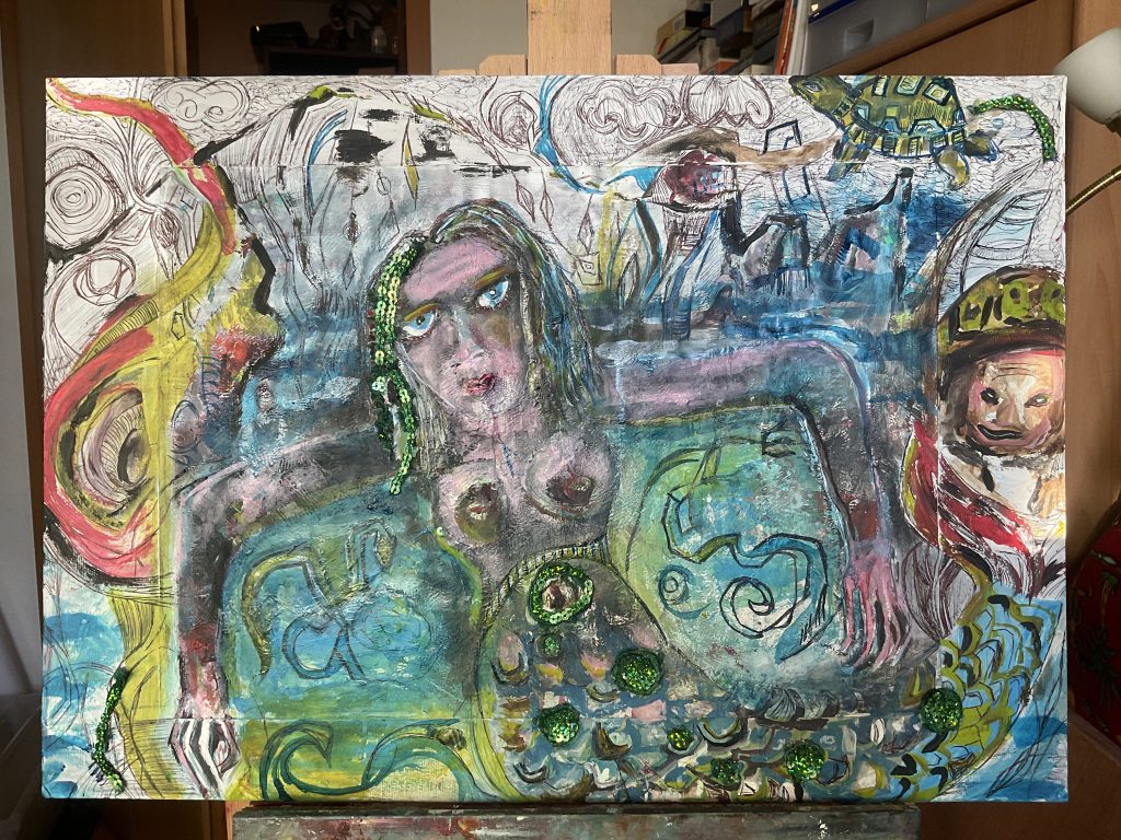 Ich bleibe dem Thema der Meerfrauen treu und habe aus einer intuitiven Laune heraus, das obige Bild gemalt. Ehrlicherweise sei gesagt, dass solche Bilder meist damit beginnen, dass ich gerade an einem anderen Bild arbeite und noch Farbe übrig habe, die ich dann “irgendwie” auf ein Blatt Papier verbringe und so kommen dann schon mehrere “Arbeitsphasen”, die eigentlich besser als Spielereien beschrieben werden sollten, zusammen, bevor ich mit der eigentlichen künstlerischen Gestaltung beginne. Manche dieser Spielereien liegen bei mir auch monatelang herum, bevor ich mich entschließe, damit überhaupt etwas anzufangen. Andere verbleiben in Kisten und dunklen Abstellkammern, haben aber im Prozess ihres Entstehens für Freude gesorgt.