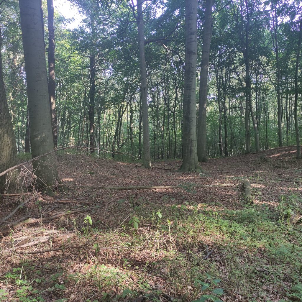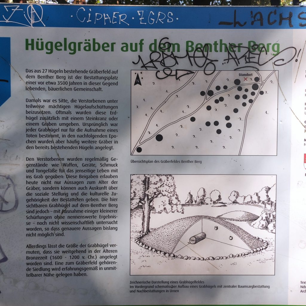 Der Benther Berg ist ca. 3,5 km lang und erstreckt sich über 100 m. Auf dem Berg befindet sich ein Gräberfeld mit bronzezeitlichen Hügelgräbern, die als solche kaum erkennbar sind. Immerhin dokumentiert ein beschmiertes Schild, dass es sich um einen ehemals spirituellen Ort handelt, der durchaus auch heute noch seine Kraft entfaltet und vielleicht ja auch bis zu den Benther Bergterrassen hin ausstrahlt.