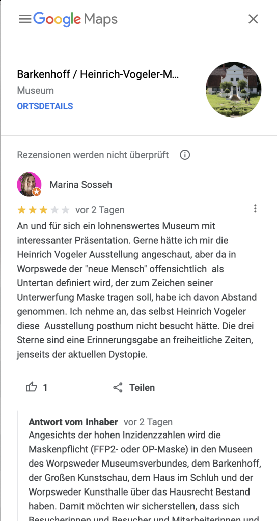 Der Heinrich Vogeler-Film “Heinrich Vogeer – Aus dem Leben eines Träumers” heute morgen in der Matinee-Vorführung in Hannover hat mich nicht wirklich begeistert, zu hölzern die Darstellung von einigen Nebenrollen und inhaltlich zu unklar. Es handelt sich ja offensichtlich um eine Filmcollage mit eingebauten schauspielerischen Szenen in der Tradition des Autorenkinos der 70er Jahre. Wenn aber die Moderation die Ich-Form vermeidet, dann wird mit der Verwendung der dritten Person eine Objektivität vorgegaukelt, die definitiv nicht vorhanden ist. Man hätte sich zur Subjektivität bekennen und offen das Künstlerleben interpretieren sollen, dann nämlich wäre das Ergebnis nicht so nichtssagend und beliebig gewesen. Befremdlich auch, dass das vorwiegend ältere Publikum sich mehreinheitlich eineinhalb Stunden unter einer Ffp2 – Maske versteckte, um sich so dem Thema des “neuen Menschen” bei Heinrich Vogeler zu widmen. Immerhin wurde ich hier nicht dazu genötigt, wie in Worpsweder, wo ich mir die Heinrich Vogeler-Ausstellung aus diesem Grund nicht anschauen wollte.