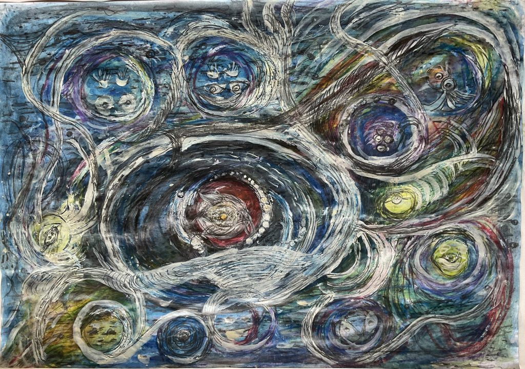 Bei Monika Bartel-Weber, die zusammen mit Wolfgang Wittek, mich in Schwangau beherbergt hat, ist aus ihrer anfänglichen Frottage eine Weltraumszene mit Elementarteilchen geworden.