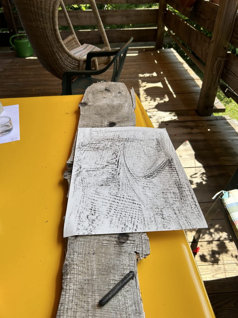 Das Wort Frottage leitet sich vom französischen Wort „frotter“, was „reiben“ bedeutet, ab. Bei dieser Technik wird Papier auf eine strukturierte Oberfläche gelegt und hernach mit einem Bleistift oder einem anderen Zeichenwerkzeug darüber gerieben. Ich selbst bevorzuge Kohle, hatte diese bei der obigen Arbeit jedoch nicht zur Verfügung. Auch strebe ich keine exakte Abreibung an, sondern versetze das Papier auf der Oberfläche immer wieder, sodass eine zufällige Komposition erzeugt wird, die mich in den Kontakt mit dem eigenen Unterbewusstsein bringt.