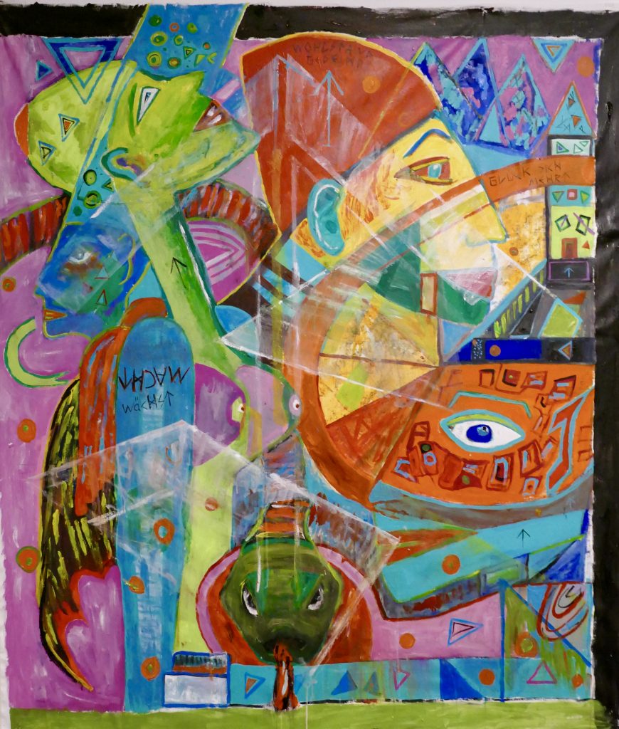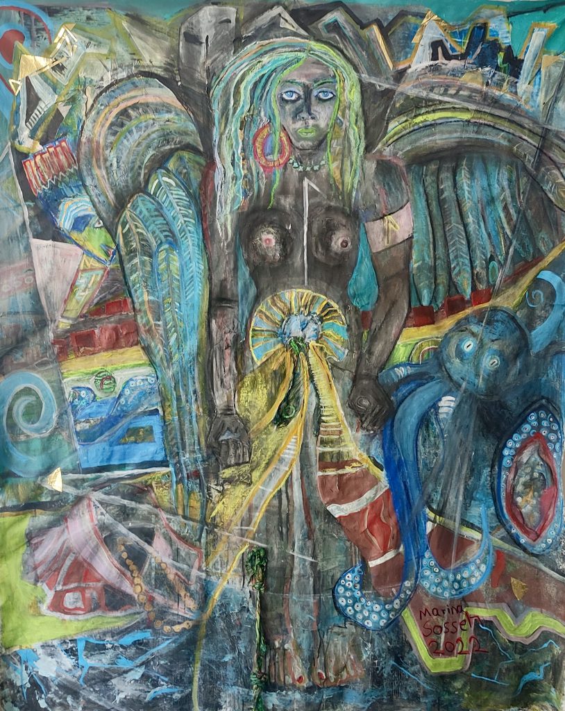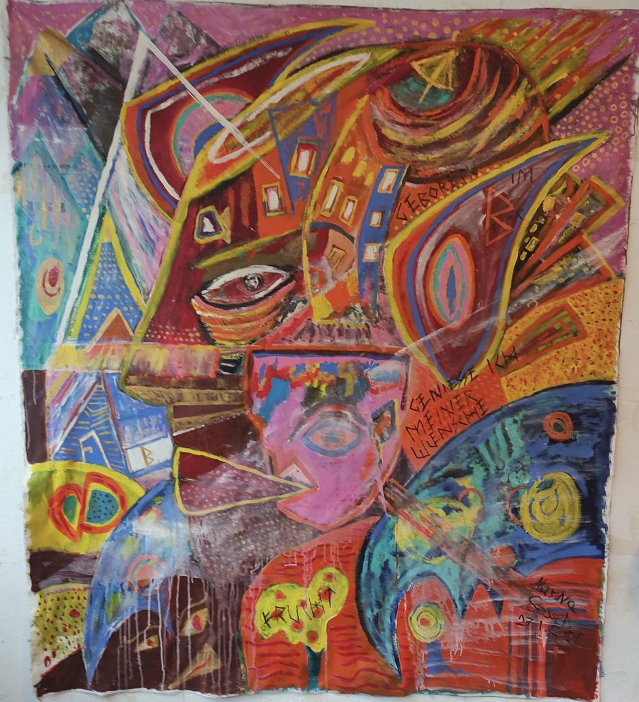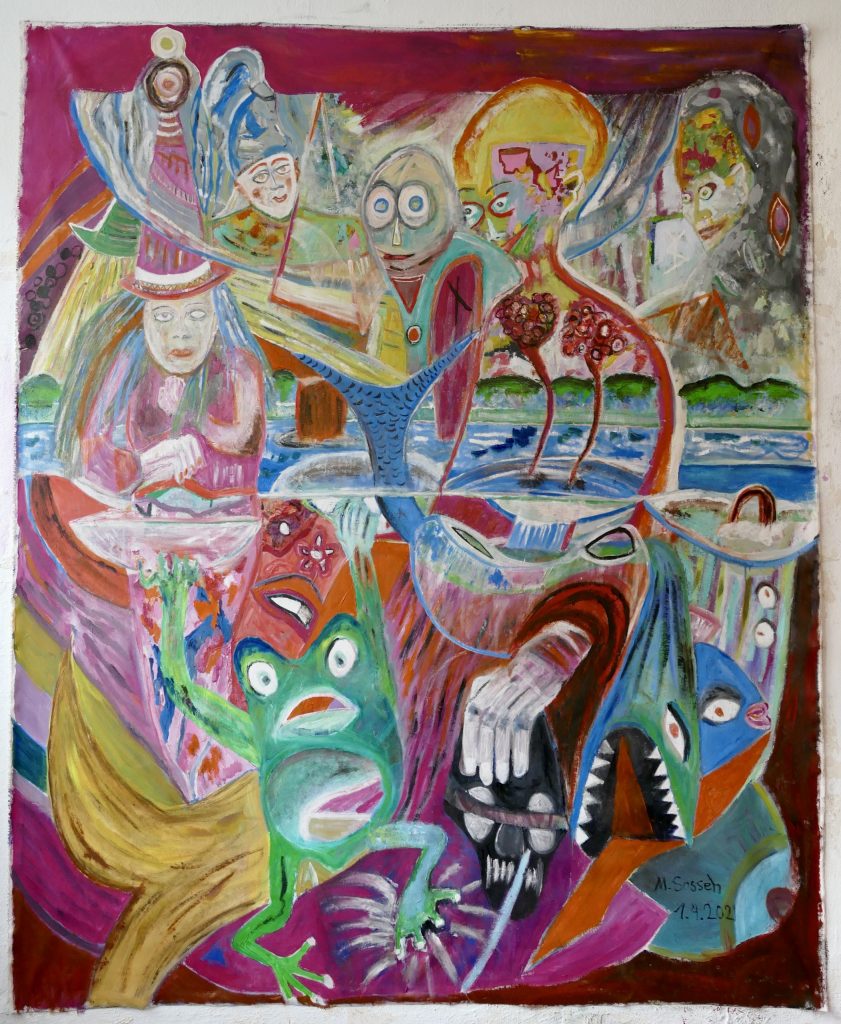 Mamiwata, the Goddess of the deep sea, Acryl auf Leinwand, 155 x 194 cm, Alfeld 2022Bar: “Geboren im BAR genieß’ ich meiner Wünsche Frucht.” Acylic on Canvas, natural Materials, 184 x 162 cm (without framing), January 2021, AlfeldTyr: “Des Kampfes Furcht”. Acrylic Painting, 185 x 165 cm (without framing), January 2021, AlfeldNot: “O mein Wille, wende aller Not, du meine Notwendigkeit” (Nietzsche), Mischtechnik (Öl auf Acryl), 197 x 160 cm, März 2021, Alfeld