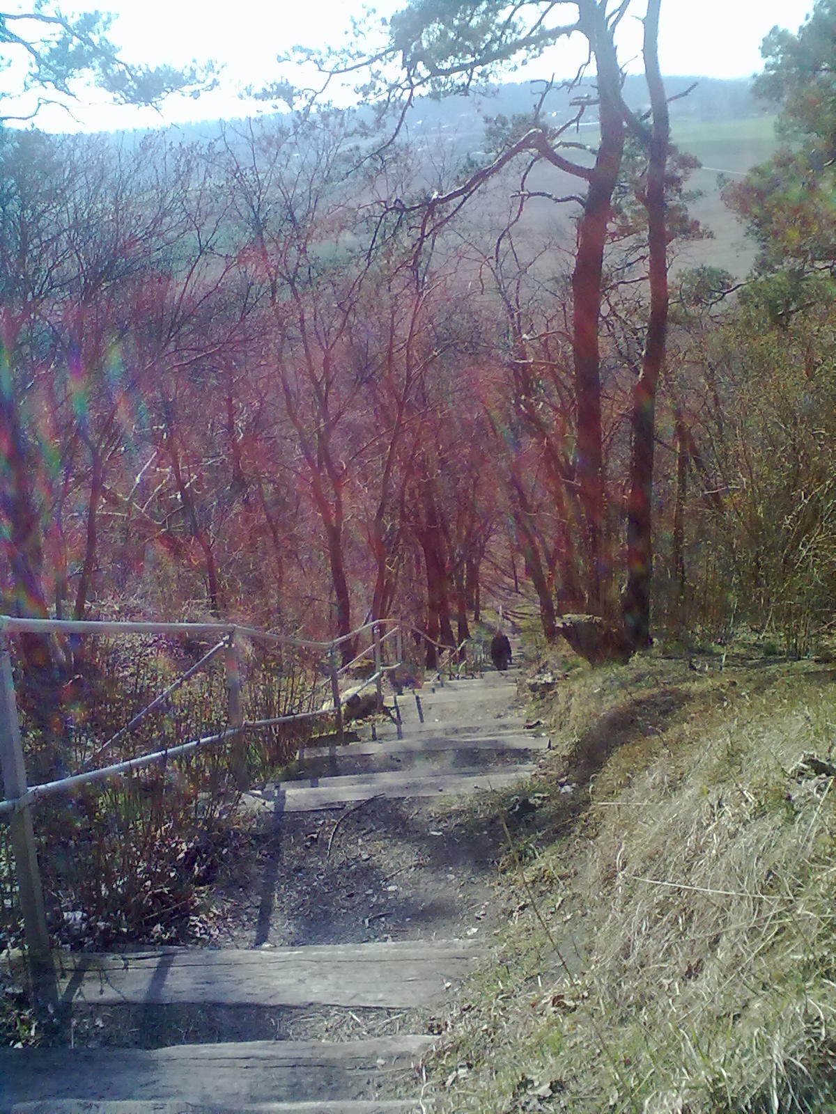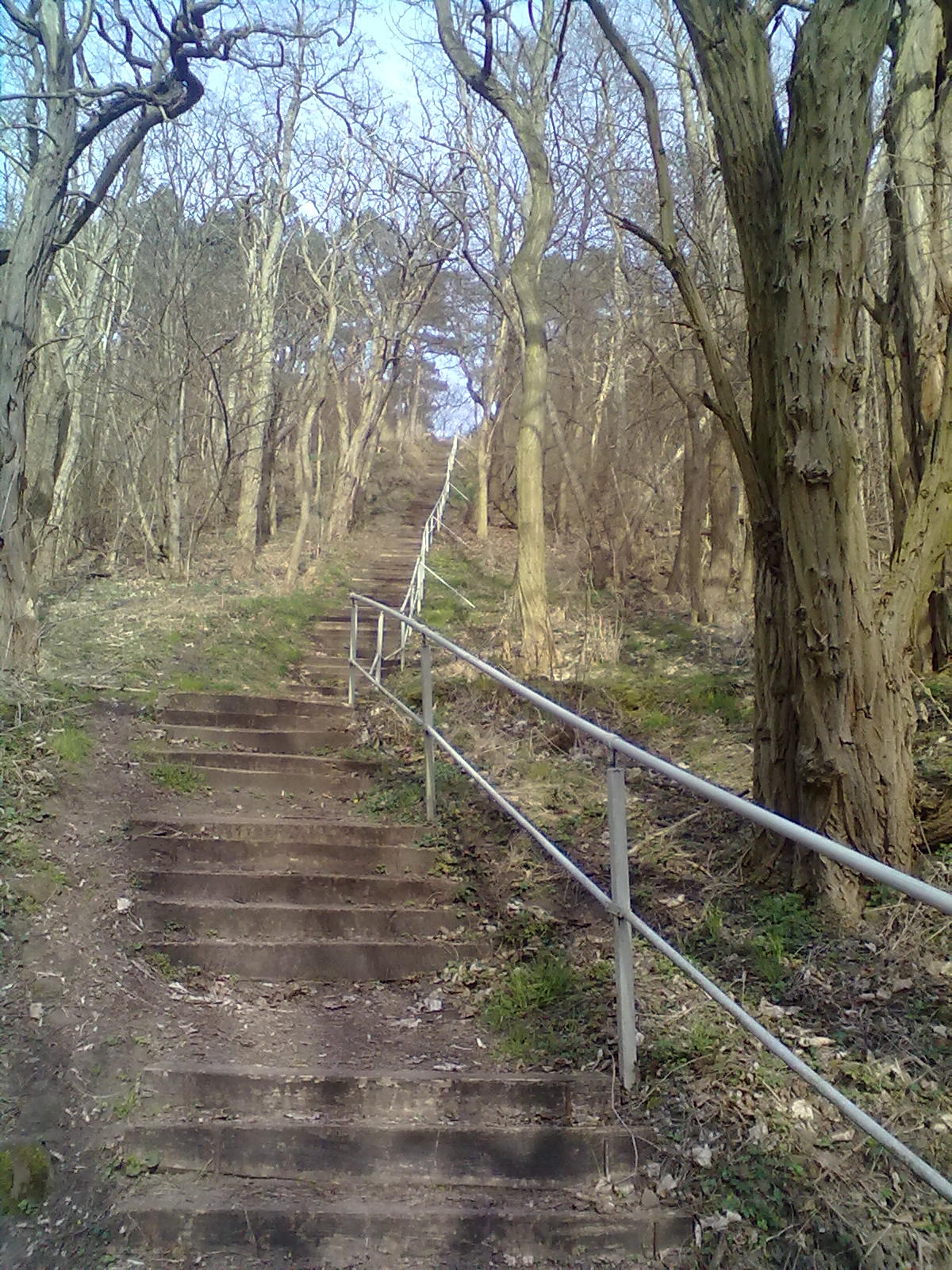 Nachdem ich mich in Lost Place-Fotografie geübt hatte, entdeckte eine meiner Freundinnen hinter der Ruine eine relativ neu angelegte Treppe, die uns, das war schon beim ersten Anblick klar, in ihren schrecklichen Ausmaßen gleichermaßen sportlich abschreckte, wie auch herausforderte. Doch die Neugierde trieb uns an.
