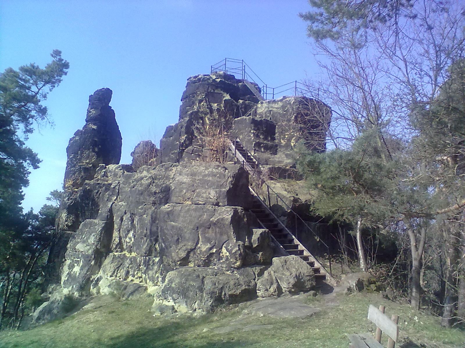 Am Ende der Treppe erwartete uns der Gläserne Mönch, gleichwohl ein Naturdenkmal als auch ein germanischer Kultort, worauf sein alter Name Thorstein hinweist. Die Felsenformation soll der Waffe des Donnergottes – dem Mjölnir – ähneln. Schaut aber selbst:
