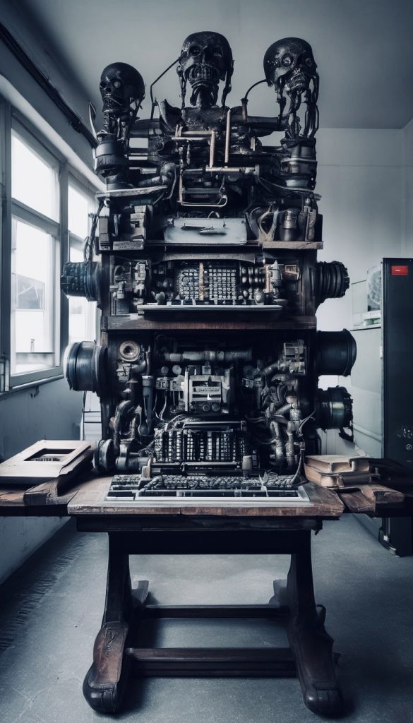 Ausgehend von den insektoiden Schreibmaschinen des Films, habe ich selbst ein wenig mit der künstlichen Intelligenz gespielt und u.a. folgende Bilder generiert.