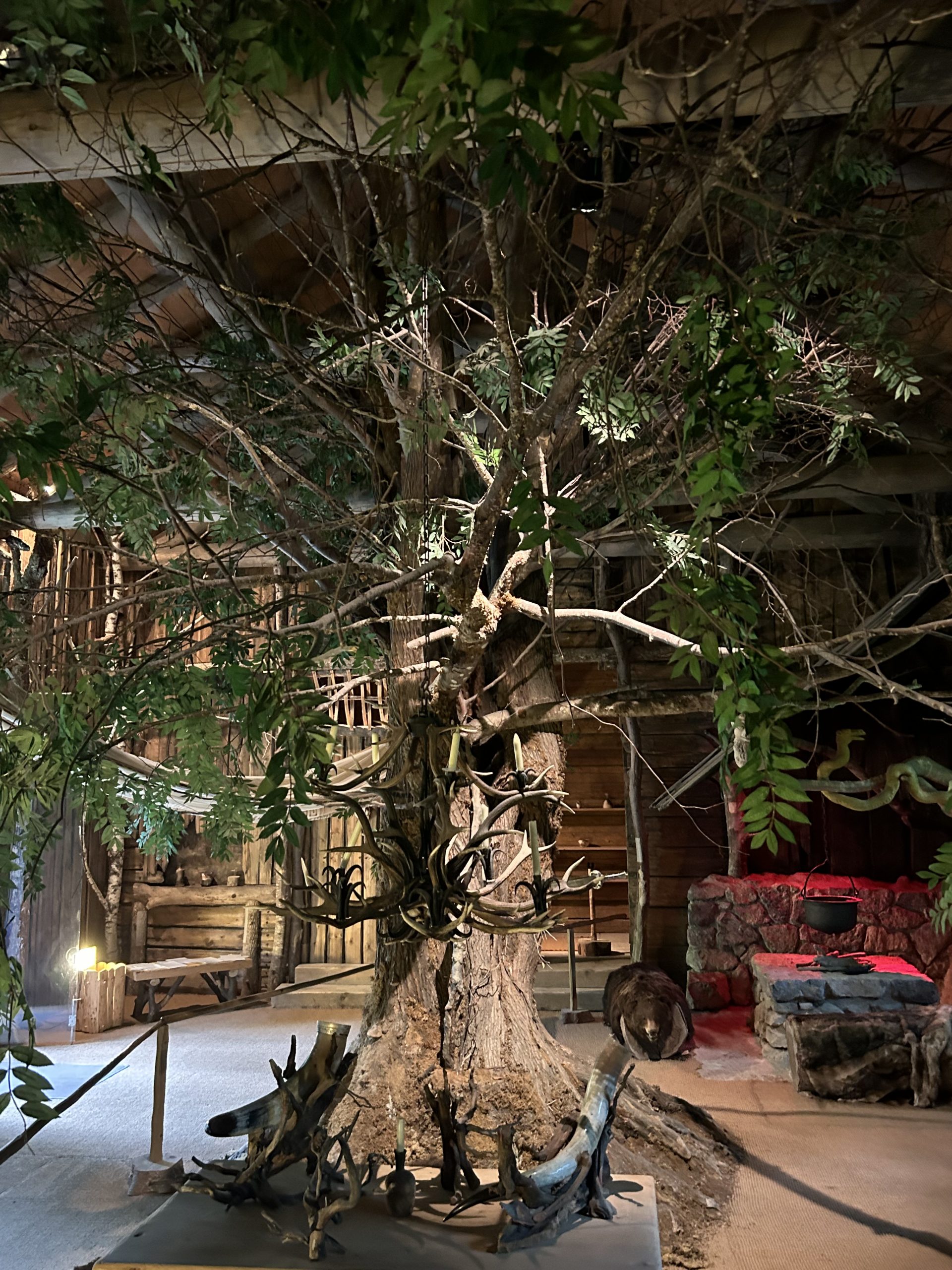 Auch die Hundinghütte ist von einer Wagner Oper inspiriert. Sie wurde nach einer Beschreibung eines Szenenbildes zur „Walküre“ von Richard Wagner errichtet. Auch hier hat sich der König in Richard Wagners Gralsträume hineinbegeben. Besonders die Weltenesche im Innern der Hütte hat mich beeindruckt. Das Schwert Nothung prangt im Stamm und wartet darauf, daß ein wahrer Held, wie Siegfried es einer war, es hinauszuziehen vermag.