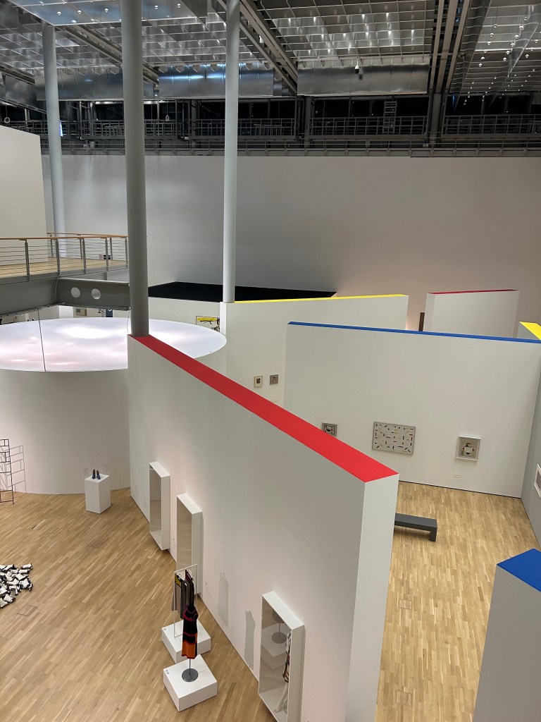 Viele Bilder von Piet Mondrian waren bei der Ausstellung im Kunstmuseum in Wolfsburg, ehrlich gesagt, nicht zu sehen, dafür aber eine beachtliche Anzahl von Werken, die auf die künstlerische Positionierung von Piet Mondrian auf irgendeine Art und Weise reagieren, sei es, dass das Farbschema epigonenhaft aufgenommen wird, die klaren schwarzen Linien anarchistisch verformt oder seine abstrakten Bilder als Fragmente auf großflächig bemalten Leinwänden wieder auftauchen. Auch ein Ausflug in die Welt der Gebrauchsgüter, wo das Mondrianische Farbschema aufgegriffen und so zum beliebigen Allgemeinplatz wird, durfte nicht fehlen. So wird dann aus künstlerischen Positionierungen schöner Kitsch.