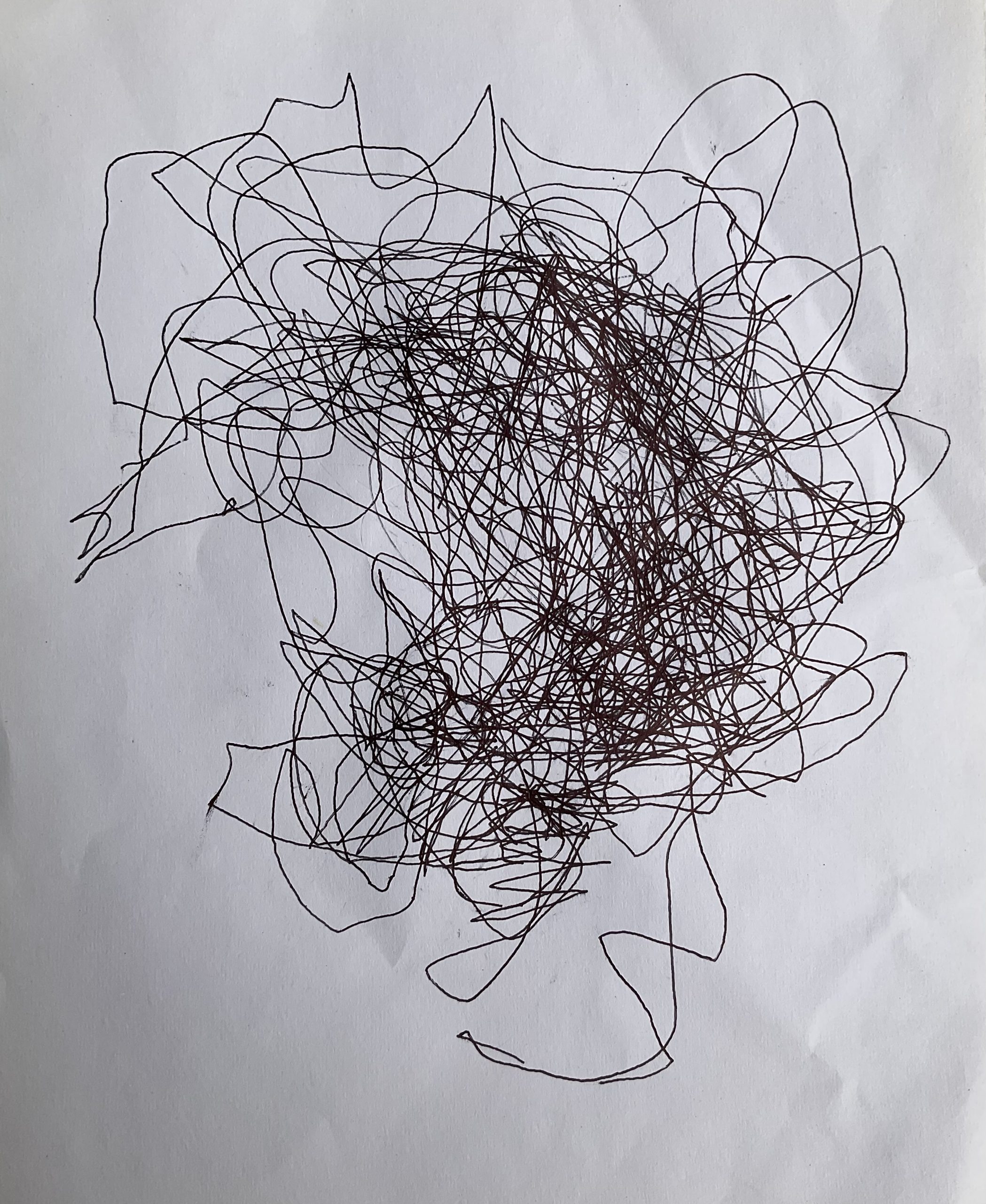 Abstrakte Zeichnung in Schwarz auf weißem Papier, entstanden mit geschlossenen Augen und der nicht-dominanten Hand als zehnminütiges Experiment. Die Linien verlaufen unkontrolliert, überlappen sich, wirken tastend und intuitiv – ein visuelles Echo auf die Themen von Synecdoche, New York: Identitätsauflösung, Fragmentierung und das Unsichtbare im Sichtbaren.