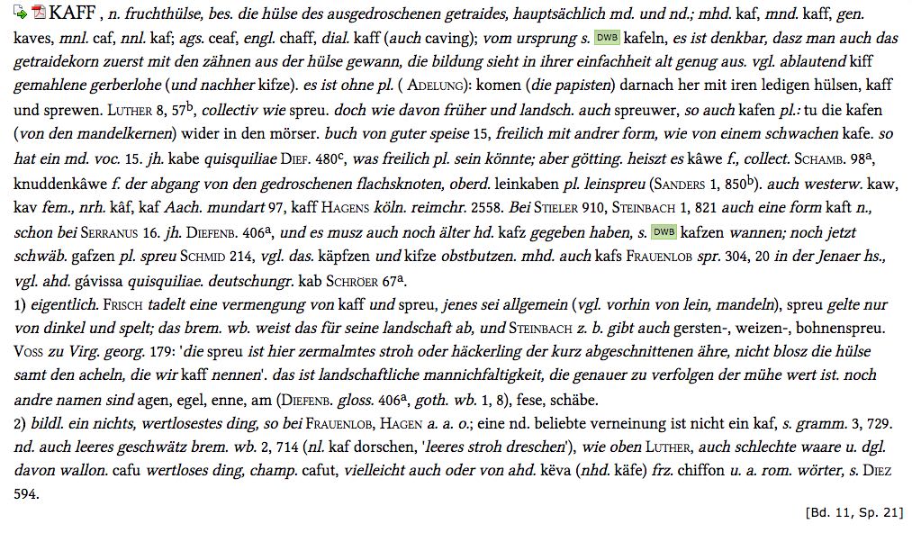 (Das ist ein Screenshot, weswegen die Schrift so furchtbar klein ist. Alles lässt sich aber im Deutschen Wörterbuch von Jacob Grimm und Wilhelm Grimm nachlesen.)