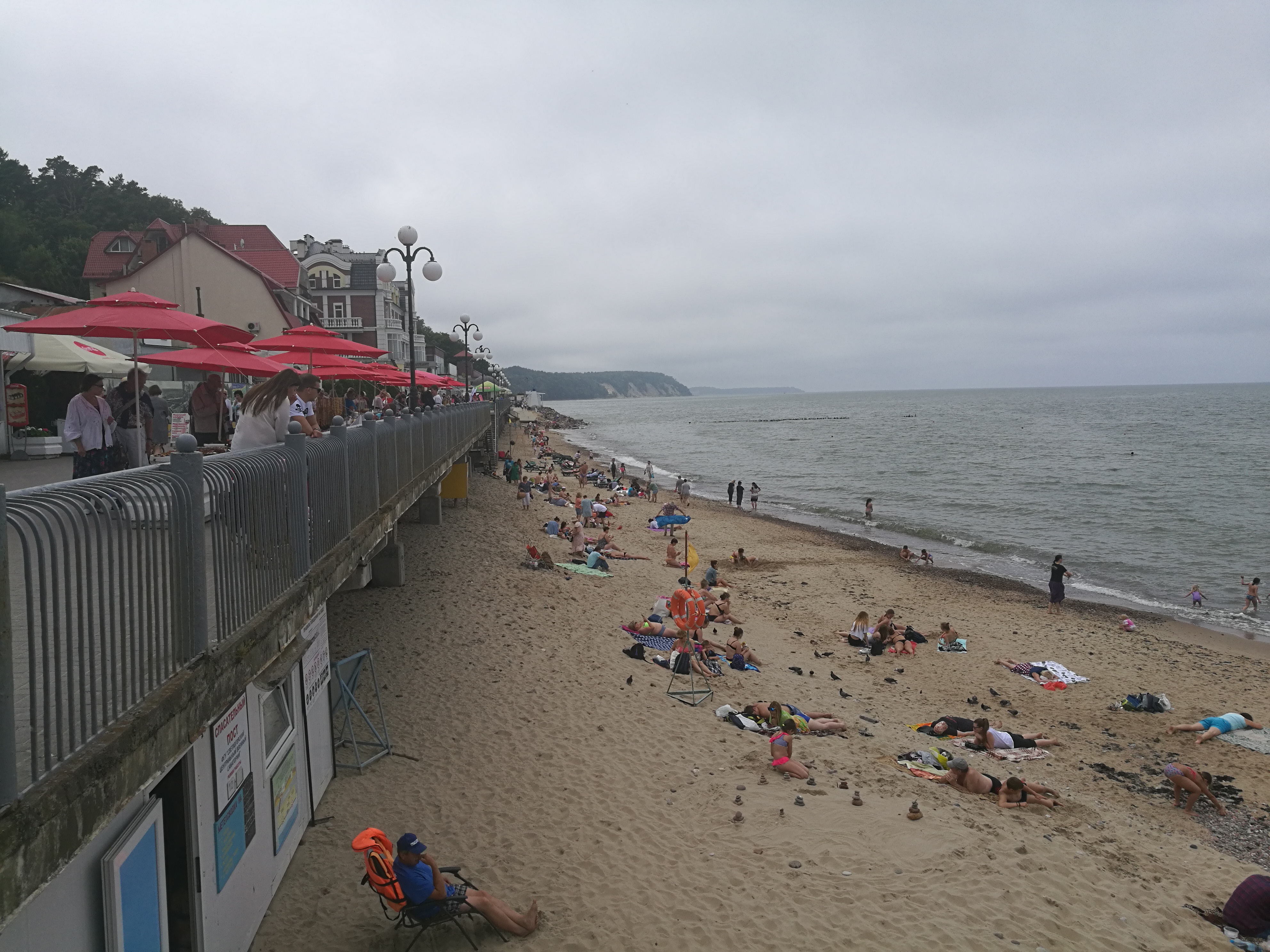 Das einzige Hotel am Platz stammt noch aus deutscher Zeit und zeigt sogar noch deutsche Beschriftung. Am Hafenkai in Pillau, wo sich noch ein altes deutsches Gasthaus (Der Goldene Anker, heute: Hotel Zolotoj Jakob), was auch jetzt als Hotel genutzt wird befindet, spreche die Reiseleiterin darauf an, ob es stimmen würde, dass der U-Boot-Kapitän, der die Wilhelm Gustloff beschossen und zum Untergang gebracht hat, in Königsberg mit einem Denkmal geehrt werden würde? Sie bestätigt diess und ich spreche mein Unverständnis darüber aus, betone gar, dass ich das geschmacklos finde, und bin bald im heftigsten Disput verwickelt. Hier, im Lande der militärischen Präsenz und der Heldenverehrung, scheint das Mitgefühl für deutsche Zivilopfer gering zu sein.