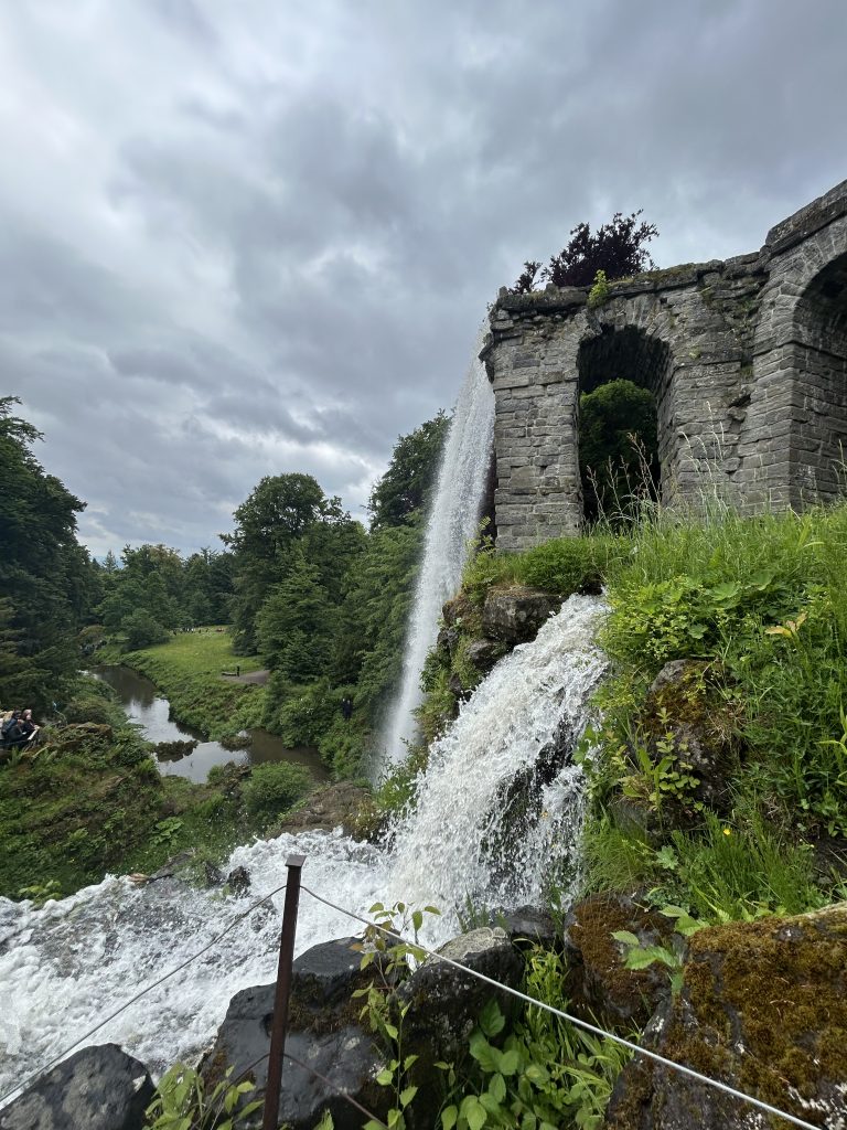 Was mich besonders in Bann zog, war der große Wasserfall am künstlichen Aquädukt – eine Ruinenarchitektur, wie aus einem Traum von Piranesi. Kein echter Gebirgsbach, kein Natursturz, sondern ein inszeniertes Wunderwerk: gebaut, um zu erinnern, zu täuschen, zu bezaubern. Das Wasser fällt dort dramatisch in die Tiefe, fast 30 Meter – und der Blick in das fallende Weiß war wie ein Blick in etwas Uraltes.