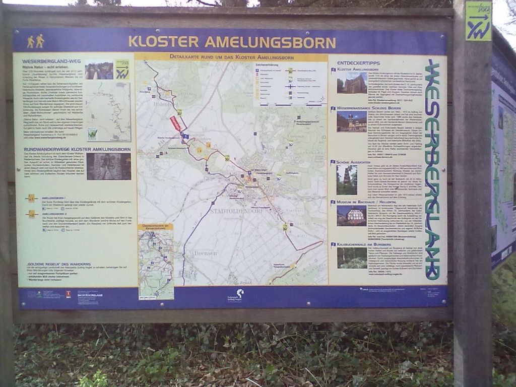 Nachdem wir die Weserbrücke in der Innenstadt Bodenwerders überquert hatten, führte uns mein GPS-Gerät steil hinauf, bis wir schließlich – schon jetzt ziemlich erschöpft – den eigentlichen Weserberglandweg erreichten. “Königszinne” verpassten wir leider durch unsere anstrengende Abkürzung.