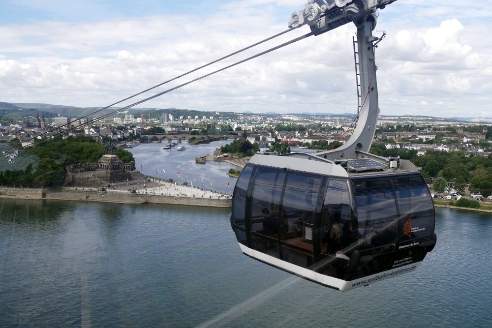Zweieinhalb Stunden Aufenthaltsdauer erlauben keine Besichtigung der Festung Ehrenbreitstein, die ich aber glücklicherweise aus der Vergangenheit schon kannte. Die 20xx zur Gartenausstellung errichtete Seilbahn war mir jedoch nicht bekannt, sodass unsere kleine Gruppe einmal in Richtung Festung hinauf und einmal hinabfuhr, was zumindest fotografisch recht interessant war. Am Nachmittag bezog sich leider der Himmel, sodass nach Königswinter sogar ein kleiner Regen einsetzte, der mich in die Lounge flüchten ließ. Dort wurde, wie auf der gesamten Reise, einmal Temperatur gemessen, womit dann den Coranaauflagen Rechnung getragen wurde.