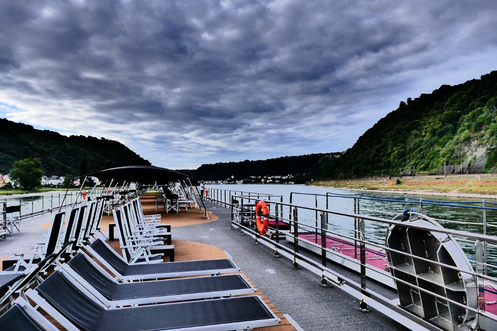 (21.07) Ich freute mich auf einen entspannten Flusstag und wirklich war die Fahrt über den Rhein bei bestem Wetter eine Wohltat für gestresste Gemüter. Ich würde mir wünschen, dass bei solchen Kreuzfahrten weniger in der Nacht und mehr am Tage gefahren würde, schließlich ist das entspannte Genießen auf dem Deck ja genau das, was sich einen für eine Flusskreuzfahrt entscheiden lässt. Was kann es Schöneres geben, als auf die gemächlich am Ufer vorbeileitende Landschaft zu schauen, zumal sich diese, vom Fluss aus betrachtet, meist idyllischer präsentiert, als sie in Wirklichkeit ist, schließlich sind häßliche Straßen oder seelenlose Industrieansiedlungen meist von Uferbeflanzungen verdeckt.