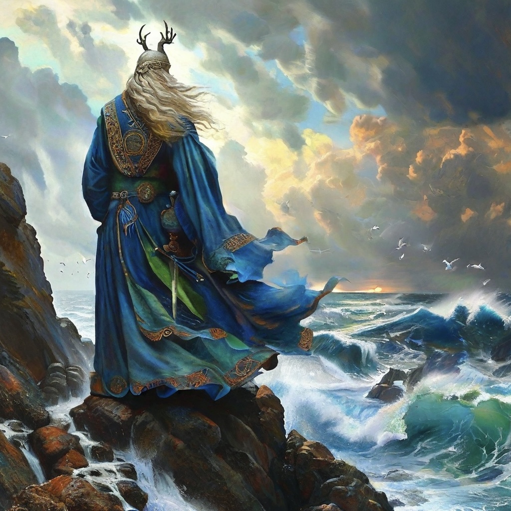 Manannán Mac Lir ist in der keltischen Mythologie der Herr der Anderswelt und Führer der Seelen ins Jenseits. Sein Reich liegt jenseits der Nebel, verborgen auf magischen Inseln, wo Zeit und Sterblichkeit keine Bedeutung haben.